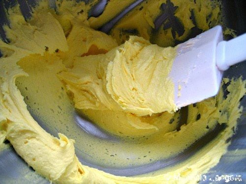 Đánh bơ mềm bằng máy trộn với một chiếc phới trong vài phút, sau đó tiếp tục cho đường, chanh và màu thực phẩm vàng, tất cả trộn đều.